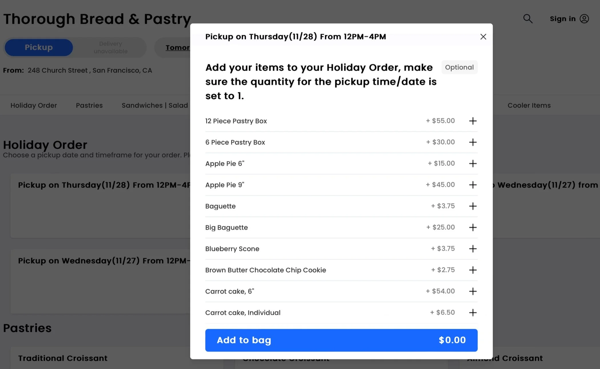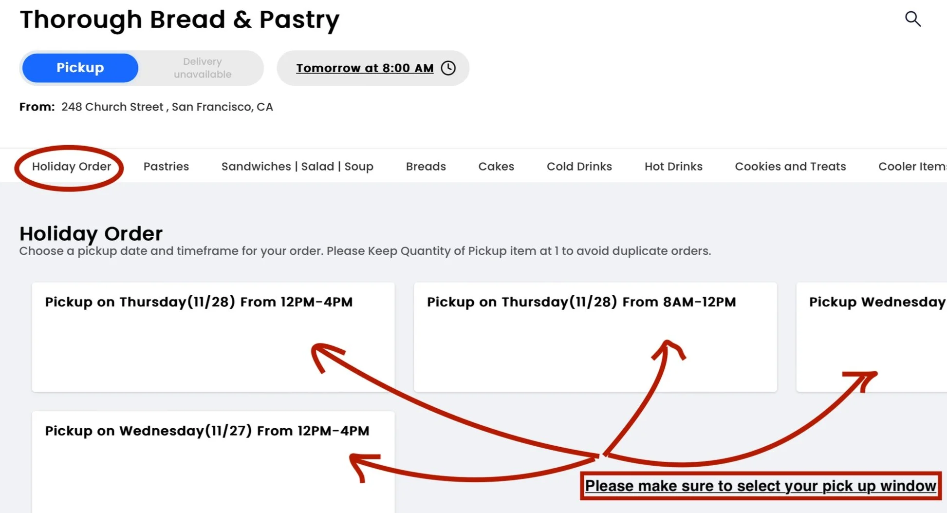 Once you see the menu options click on the “Holiday Order” section. Carefully select which pick up date and time you would like to order on.